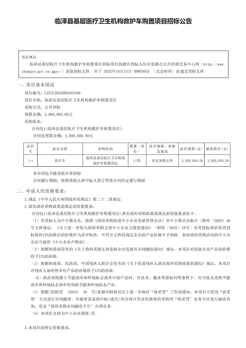 临泽县基层医疗卫生机构救护车购置项目招标公告