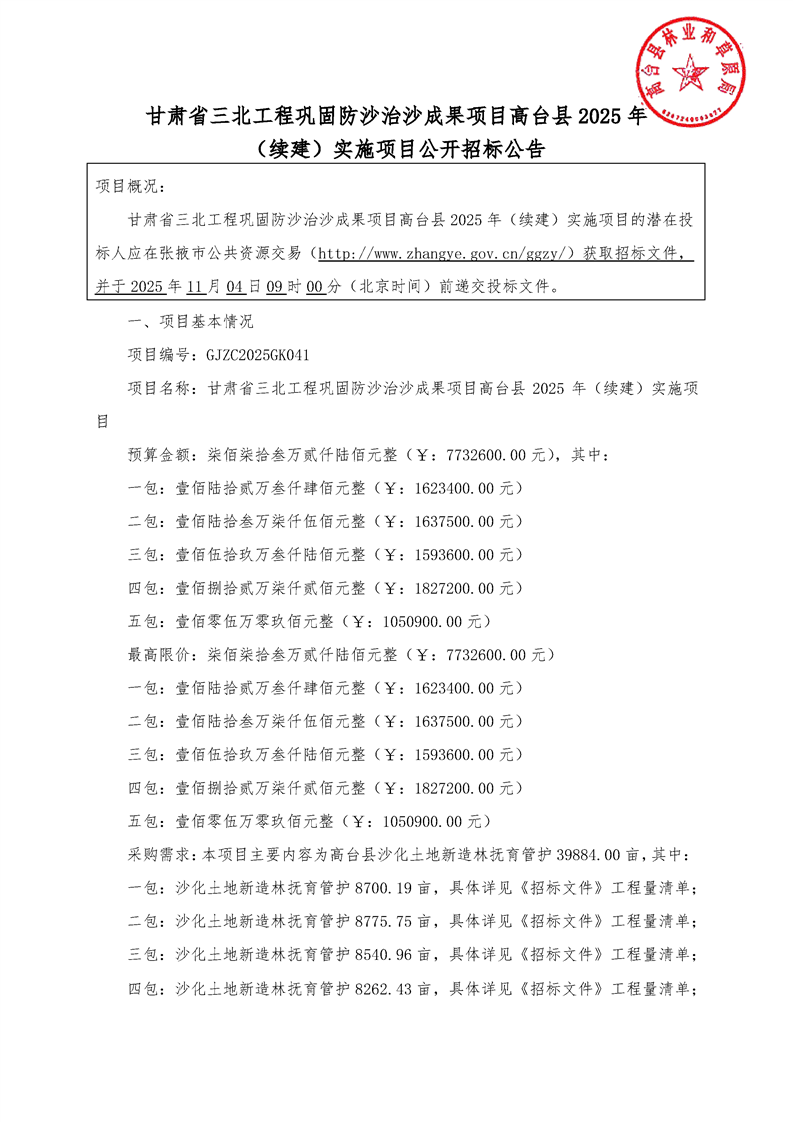 > 甘肃省三北工程巩固防沙治沙成果项目高台县2025年(续建)实施项目招标公告