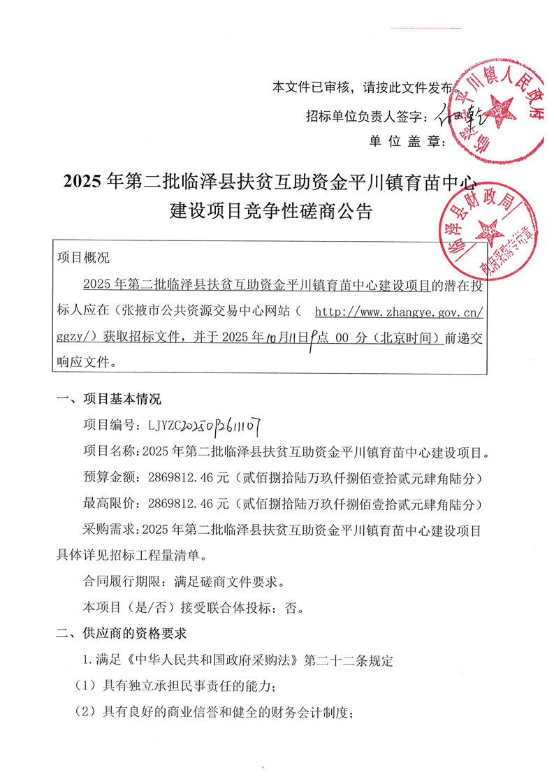> 2025年第二批临泽县扶贫互助资金平川镇育苗中心建设项目竞争性磋商公告